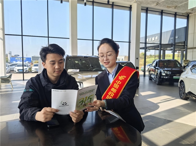 图:工作人员向购车客户宣传消保知识